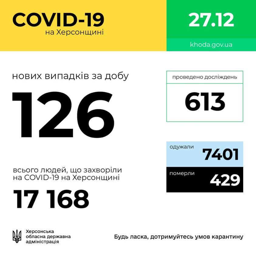 27 грудня в Херсонській області проведено 411 ПЛР-досліджень та 202 дослідження методом ІФА на виявлення коронавірусу.