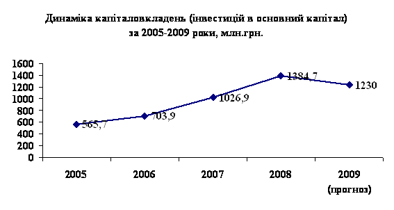 Подальше розширення інвестиційного попиту, в основному, було зумовлено необхідністю поліпшення конкурентоспроможності виробництва в умовах підвищення вартості енергетичної складової виробництва та загострення конкурентної боротьби на світовому та внутрішньому ринках. Бізнес-сектор активно здійснював заходи, спрямовані на оновлення основних фондів, упровадження енергозберігаючих технологій та модернізацію виробництва. Як наслідок, у січні – вересні 2008 року обсяг інвестицій в основний капітал збільшився на 41,8% і склав 809,6 млн.грн. Джерелами збільшення обсягу інвестицій, в основному, були власні кошти підприємств та організацій (51,9% до загального обсягу) і кредитні ресурси (20,1%).